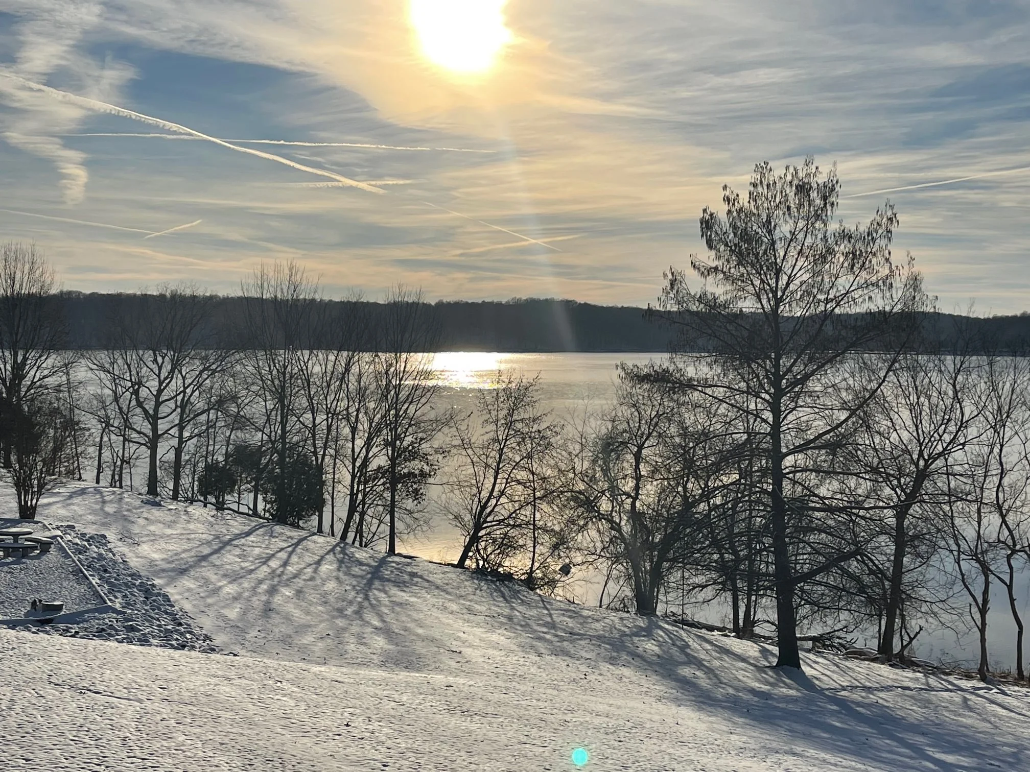 The sunset on the lake on a winter’s day reveals the beauty of the trees.